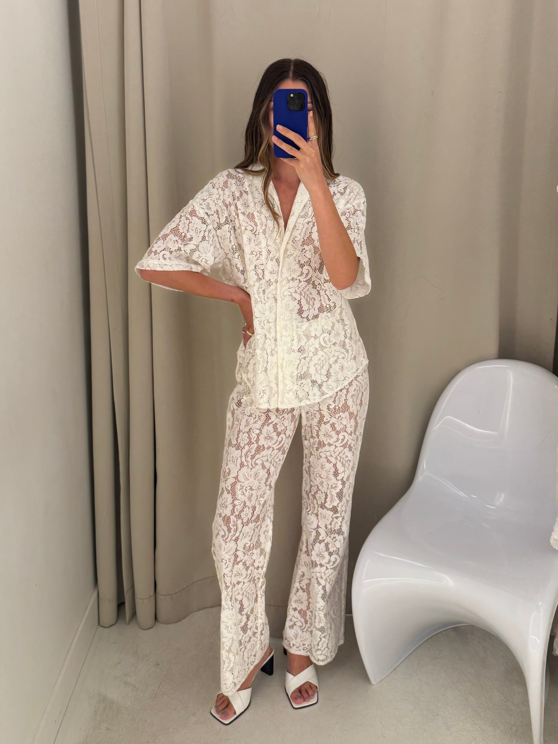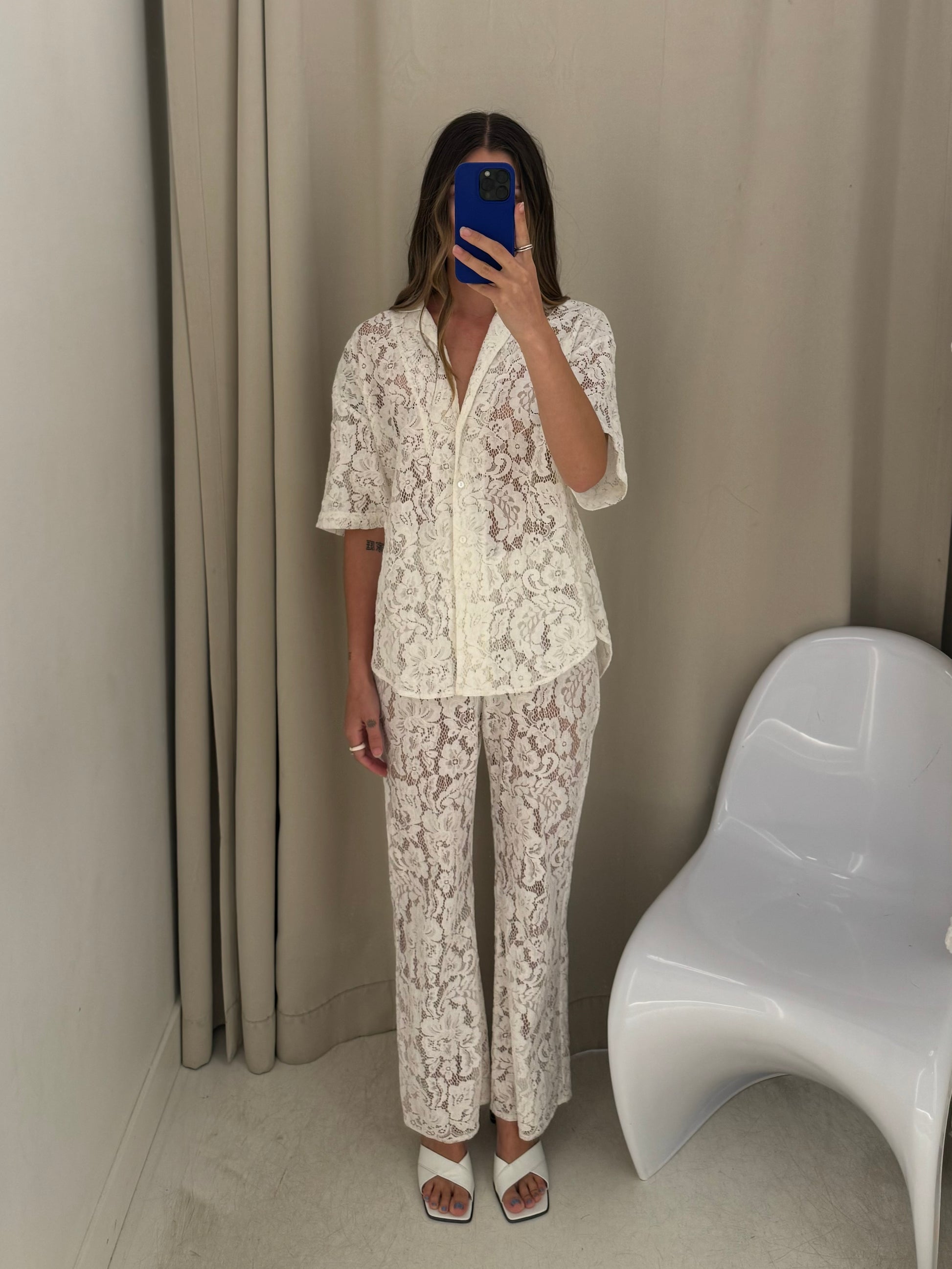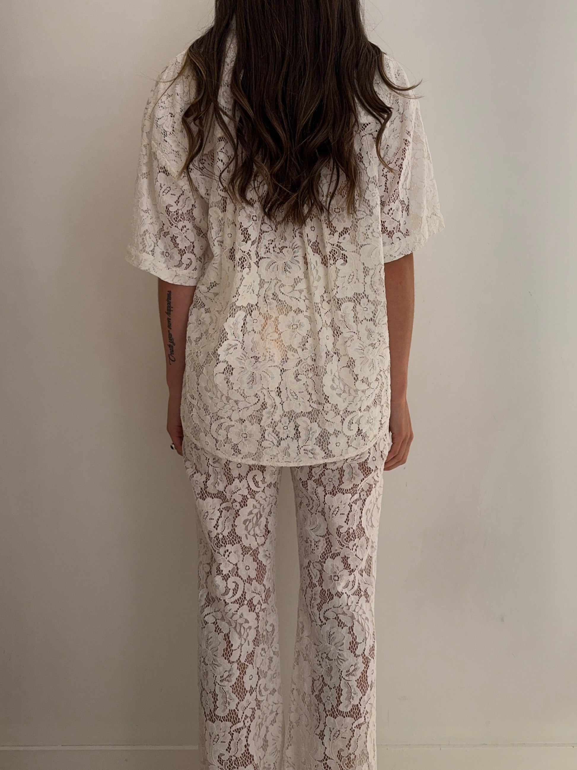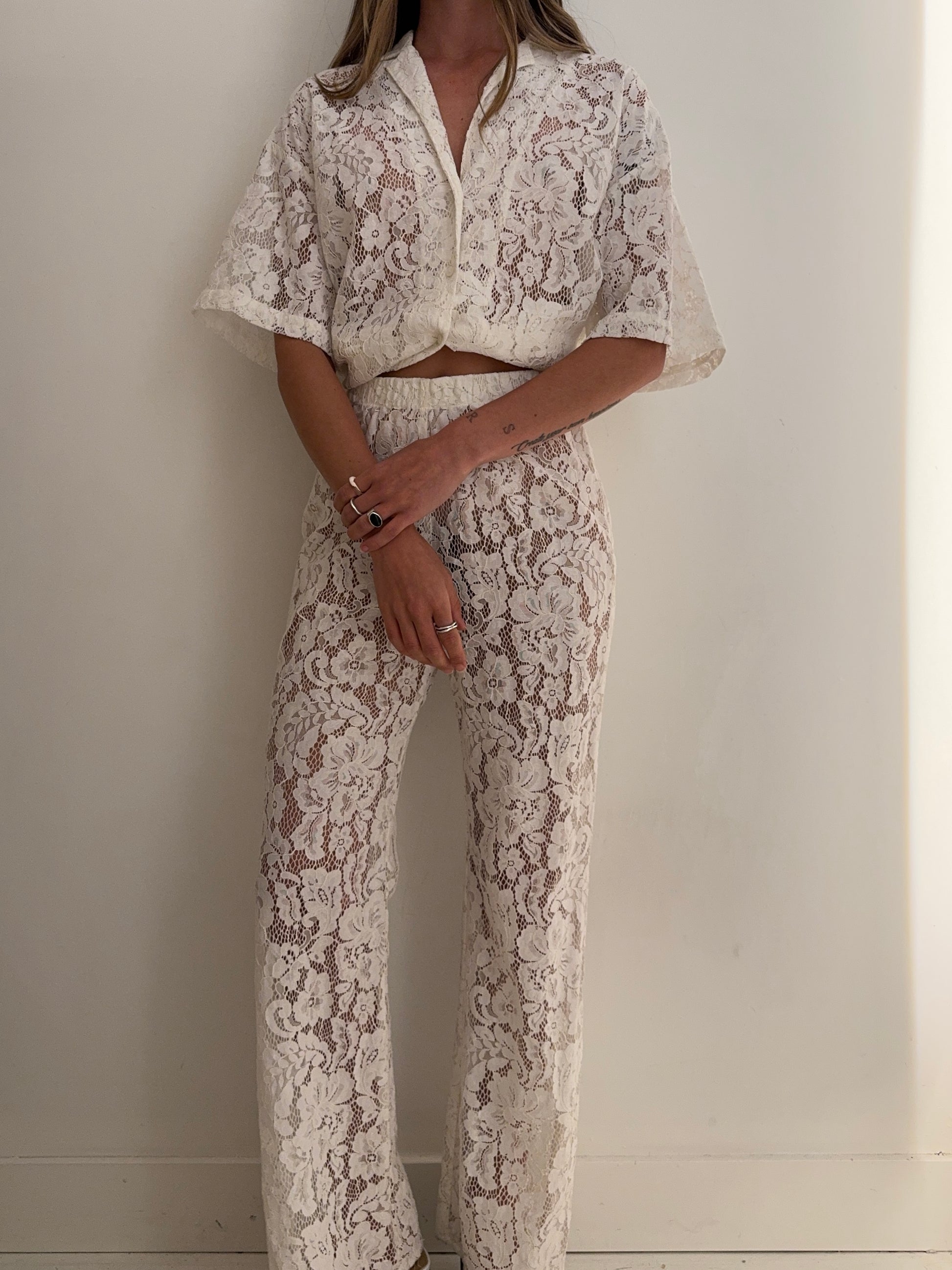 White lace set from Canadian brand A Bronze Age. Button closure short sleeve with elastic waist pant.