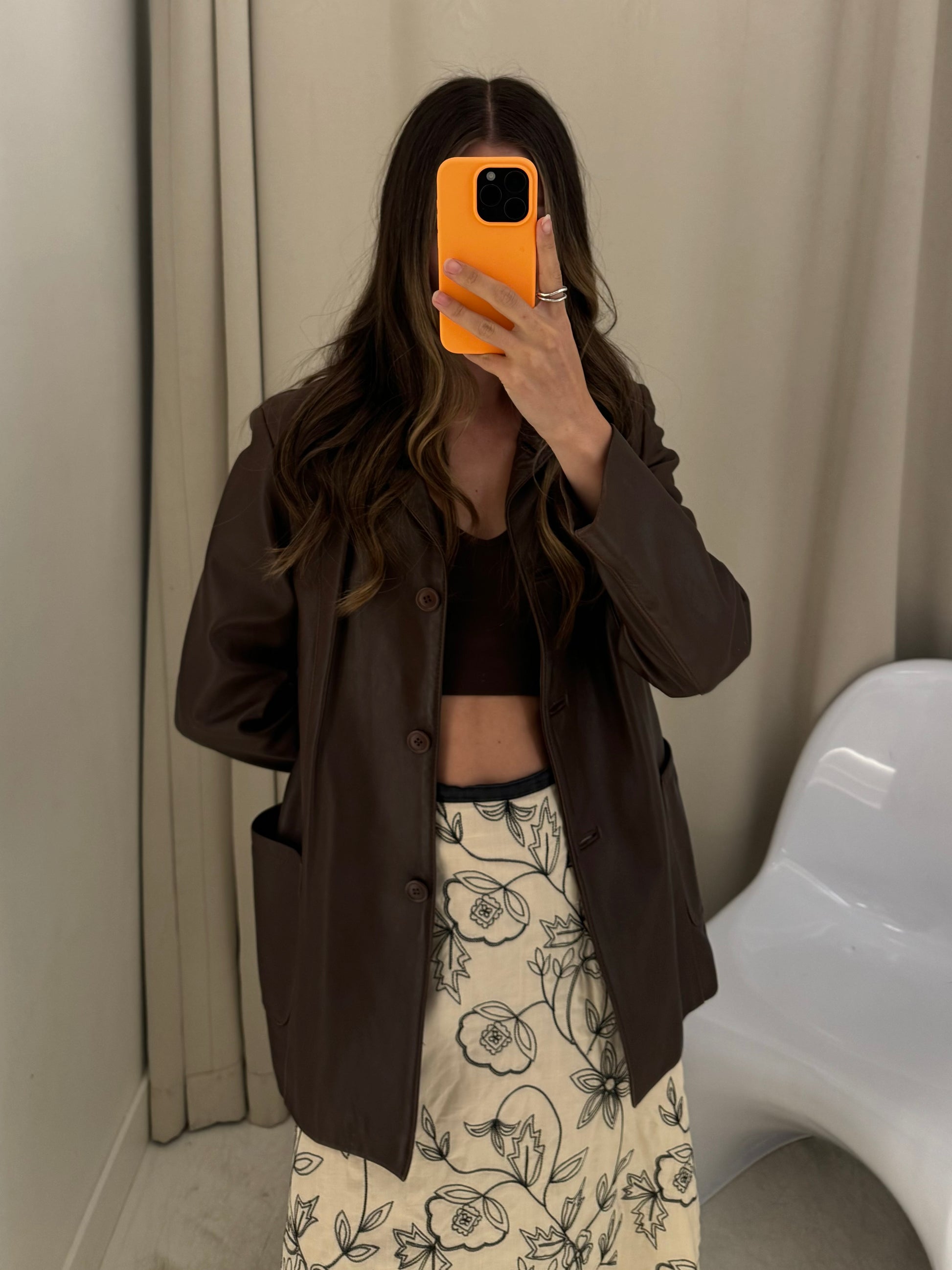 This Vintage Chocolate Leather Blazer was crafted with care in Canada using buttery soft genuine leather. The rich chocolate color adds a touch of sophistication, while the button down closure and two pockets provide both style and functionality.